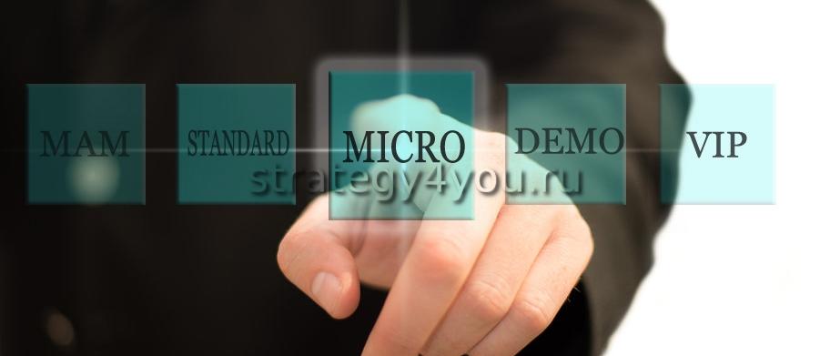 3) Счета типа “Микро” — торговля идет уже в $, но при этом минимальный объем лота — 0,01.