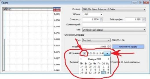 Торговый терминал MetaTrader4 предлагает одну полезную функцию – удаление в назначенное время отложенного ордера.