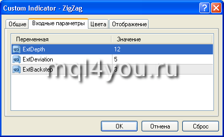 Добавим новые параметры для индикатора форекс ZigZag: