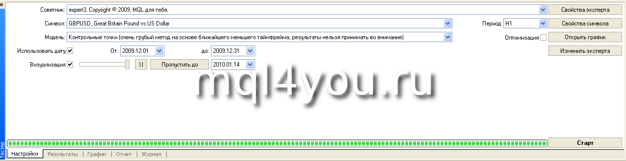Для этого запустим тестер стратегий MT4 в визуальном режиме: