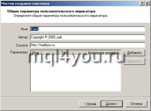 Выбираем «Пользовательский индикатор». В следующем окне указываем название Нашего индикатора форекс. Так как входные параметры нам не нужны — оставим их не заполненными: