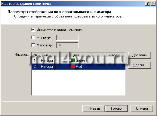 Мы выбрали тип рисования — гистограмма для отображения значений в виде вертикальных линий. После нажатия кнопочки «Готово» будет сгенерирован код индикатора форекс для MT4: