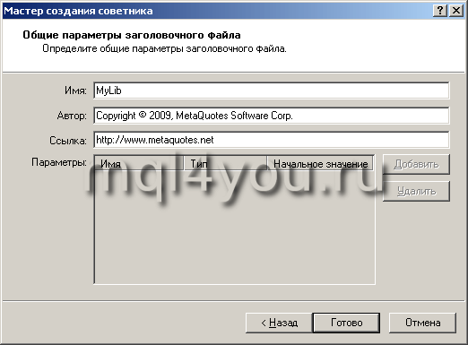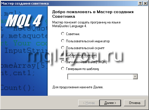 Для создания библиотеки функций MQL4 вызываем мастера создания советников в Metaeditor-е торгового терминала MT4: