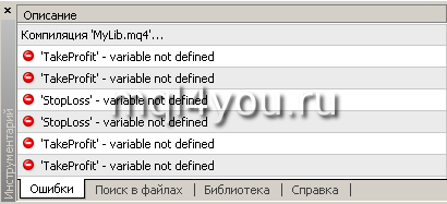 Копируем в созданную библиотеку наши функции GetLot(), NewOrder(), DelOrders(), DelOrder(), EditOrder() и CloseOrder(). Компилируем и получаем ошибку: