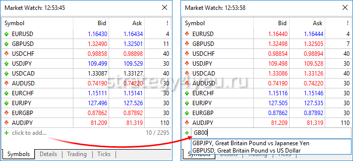 - Ctrl+B — выдает список объектов, которые добавляются к валютным парам;