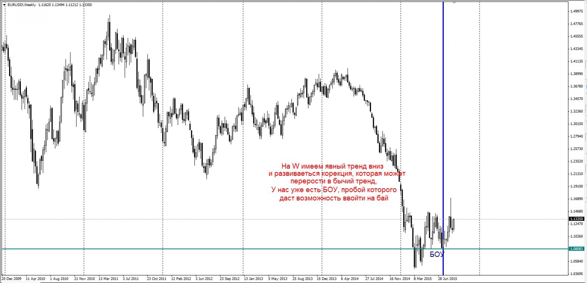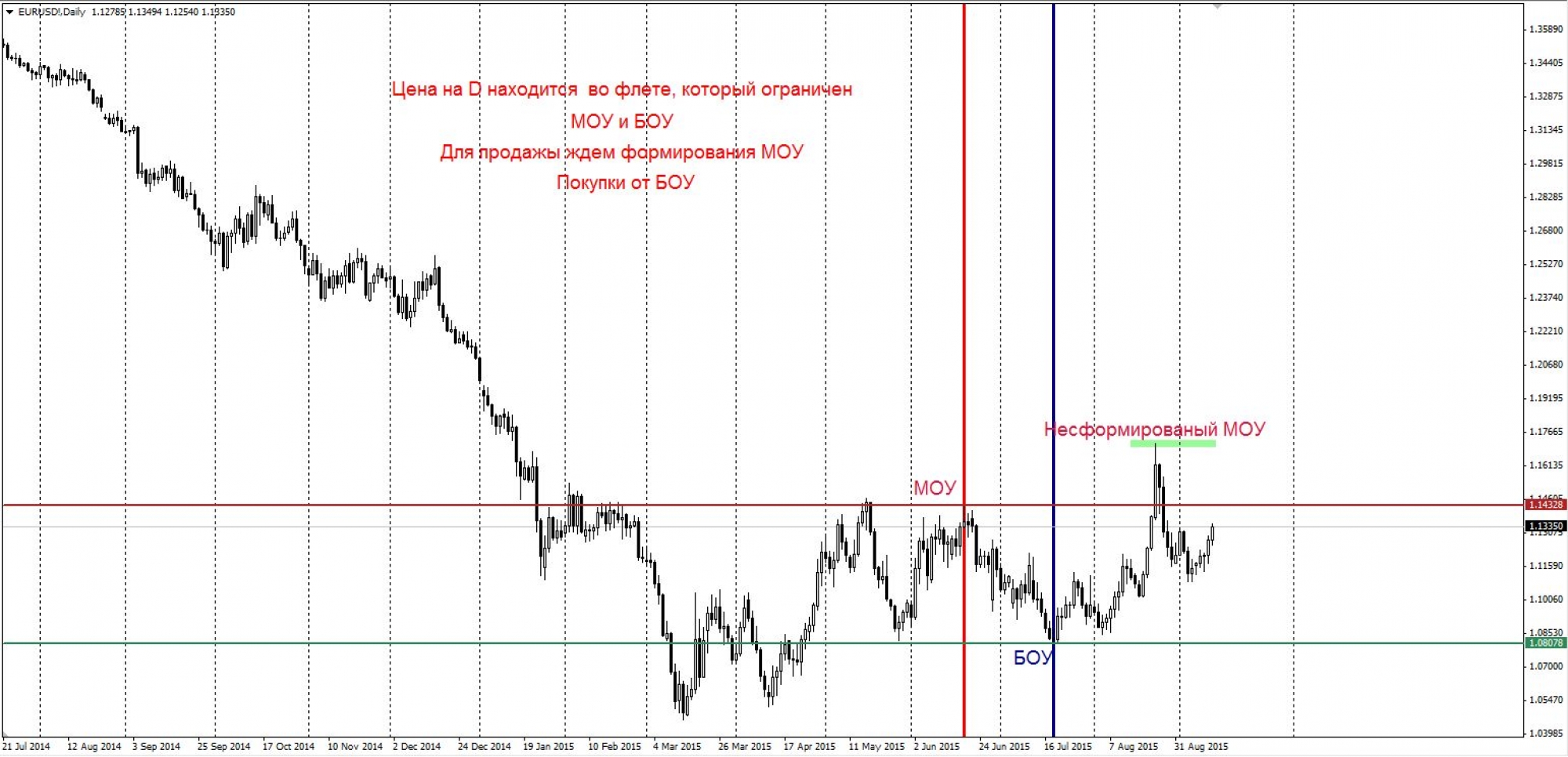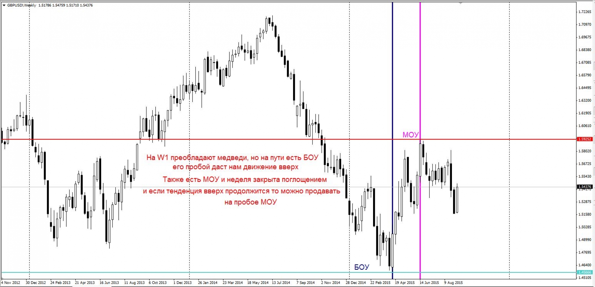 1. Недельный график — цена зажата между двумя уровнями (сверху МОУ, снизу БОУ), присутствует некая неопределенность, идет формирование БОУ, приоритет на данном ТФ покупки.
