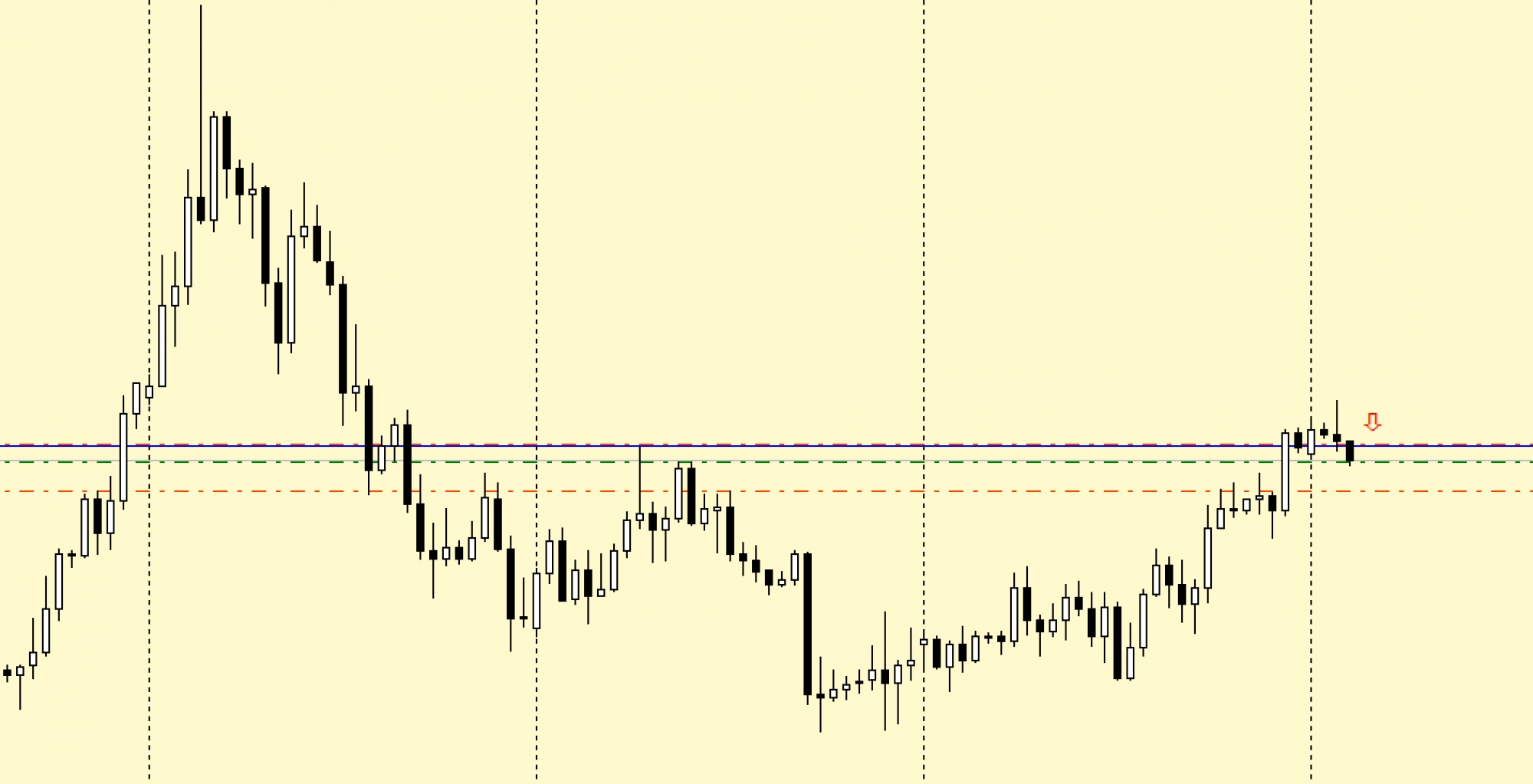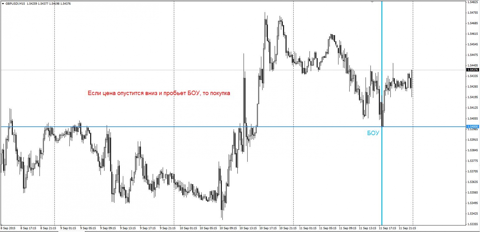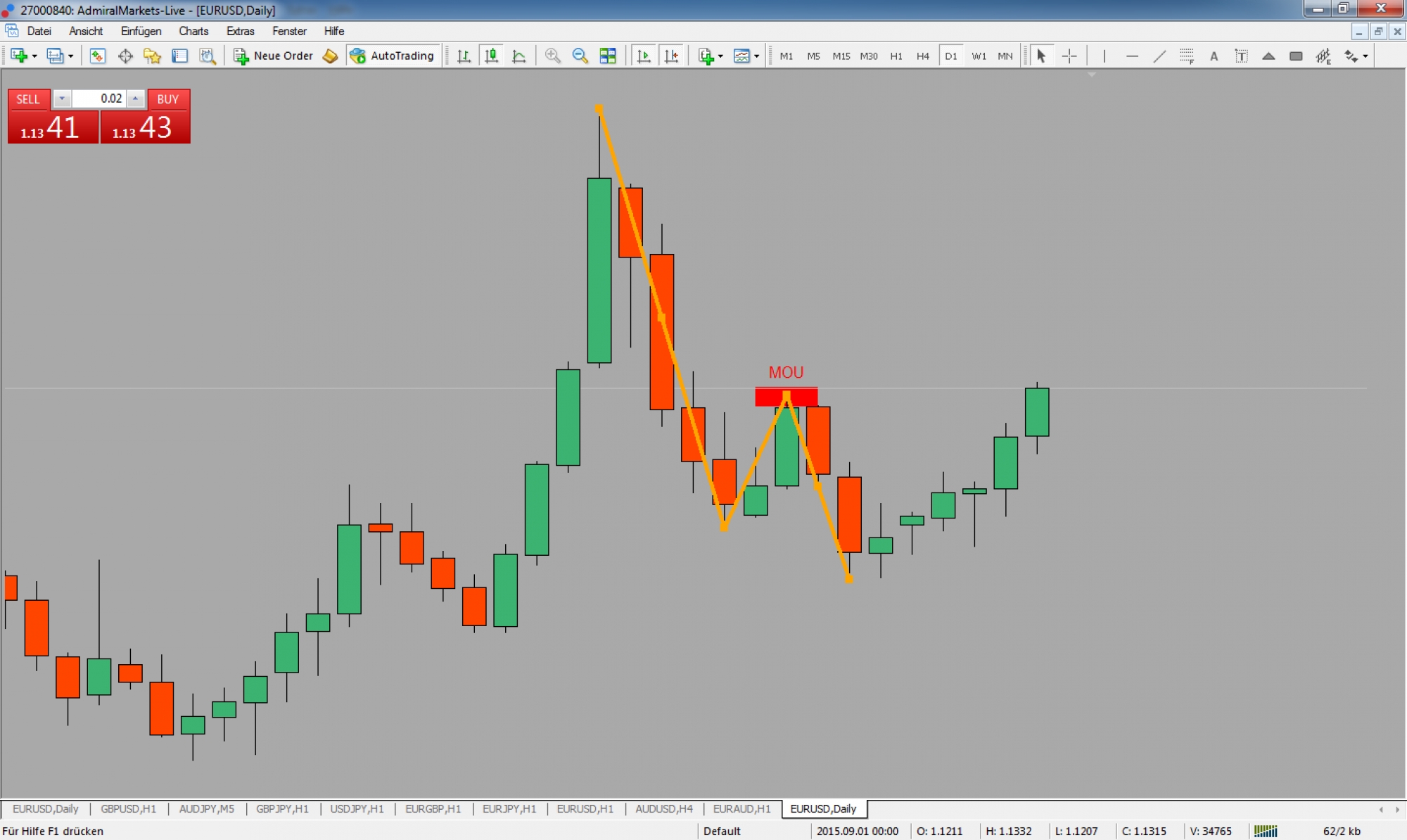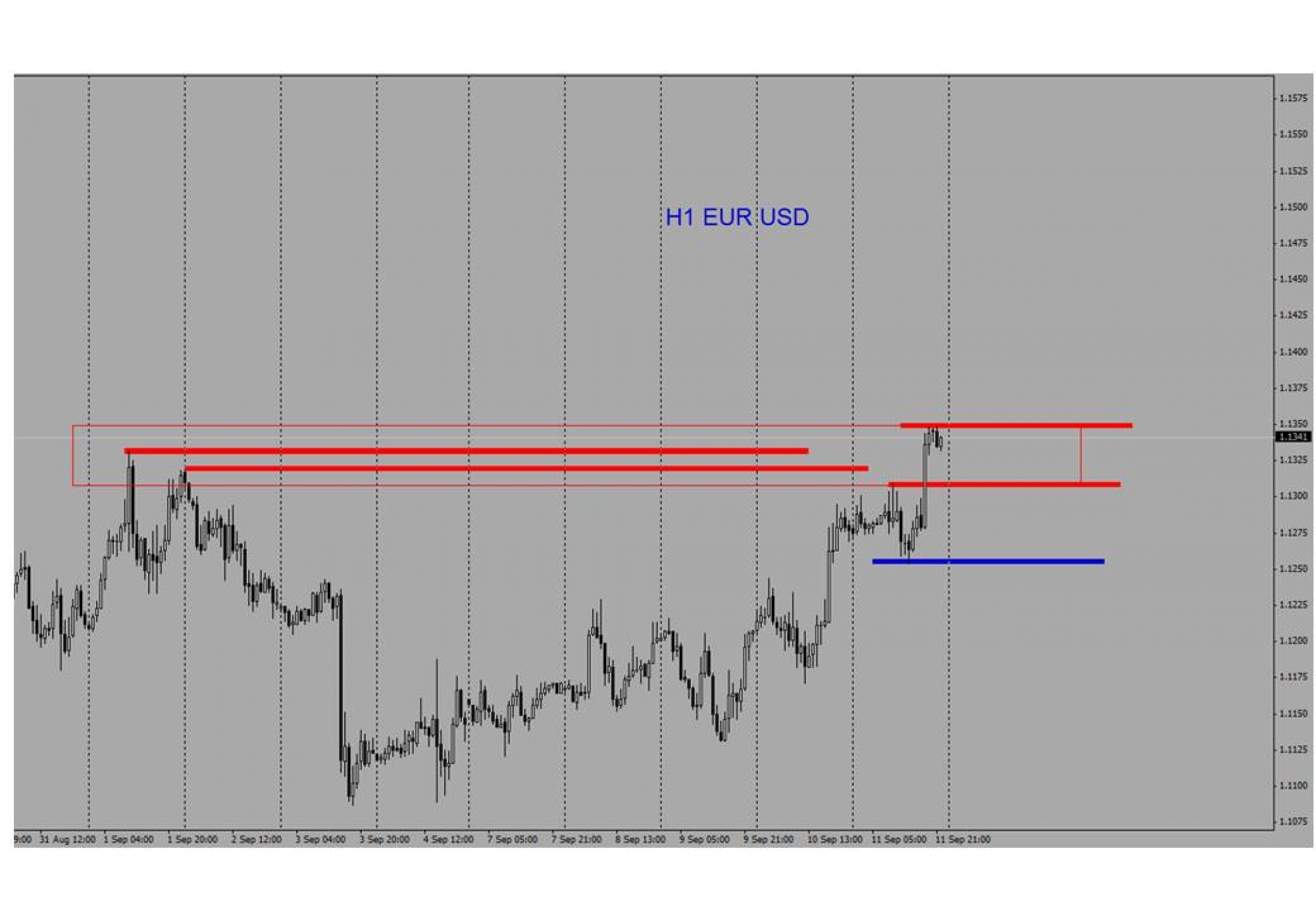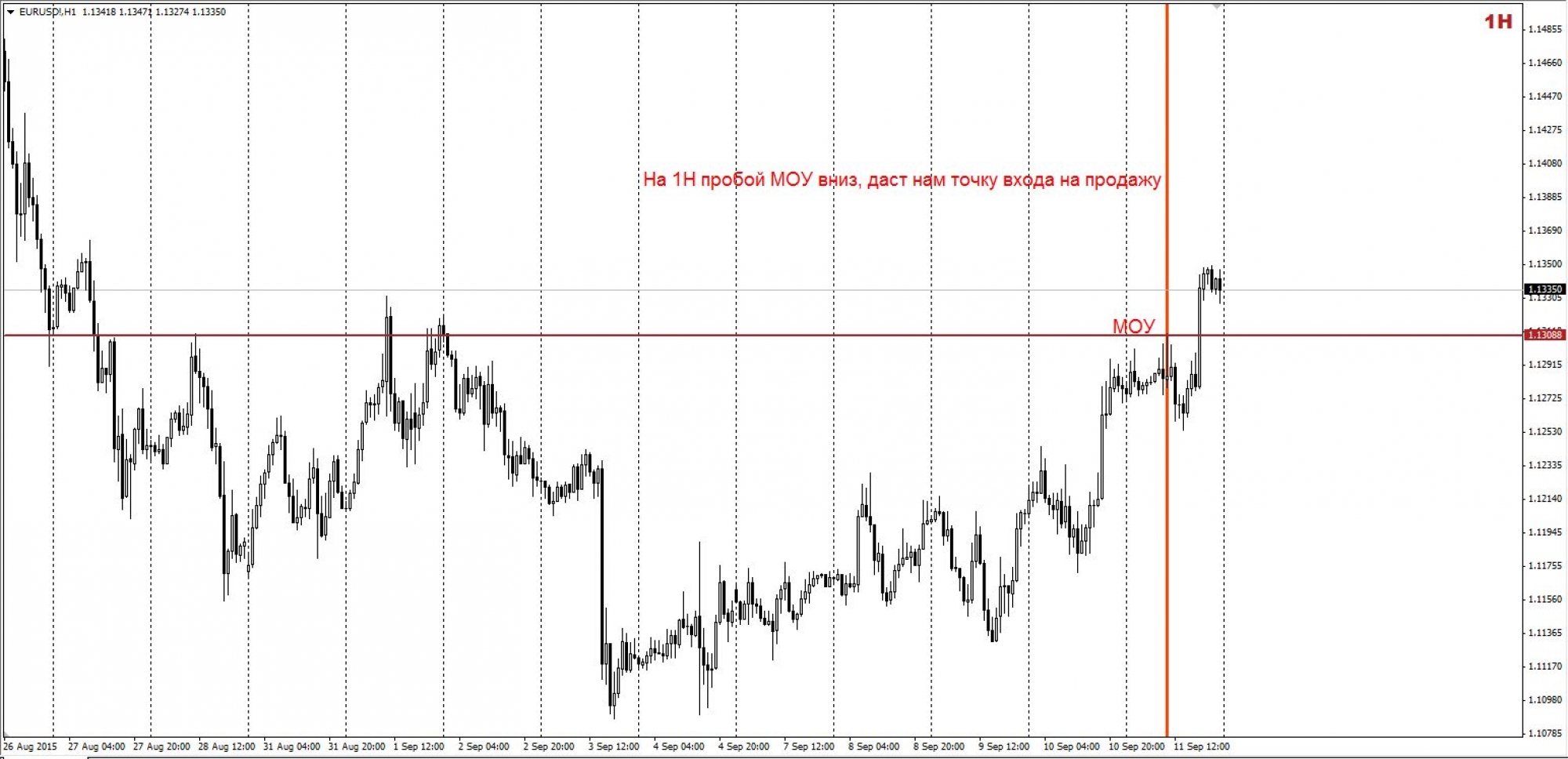 Александр, если на Евродолл цена пойдет выше МОУ 1.1348, а затем пробьет его сверху вниз, то этот МОУ и будет для нас рабочий в такой ситуации и мы будем входить в селл на его пробое. А если цена не будет перебивать 1.1348 и сразу пойдет вниз, то рабочим уровнем будет МОУ 1.1309 и после его пробоя будем входить в селл.
