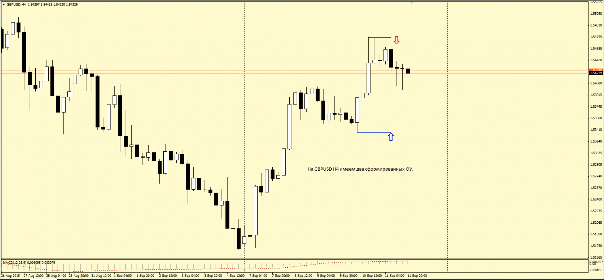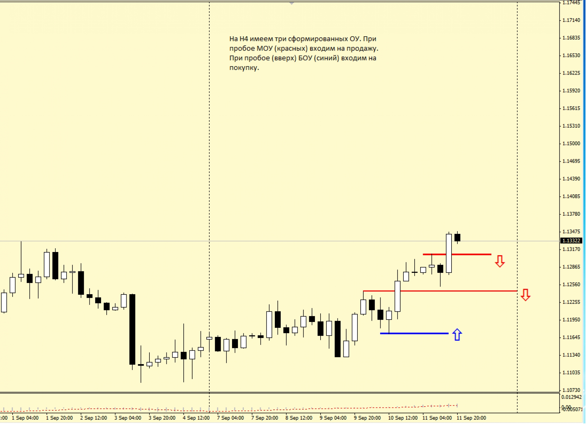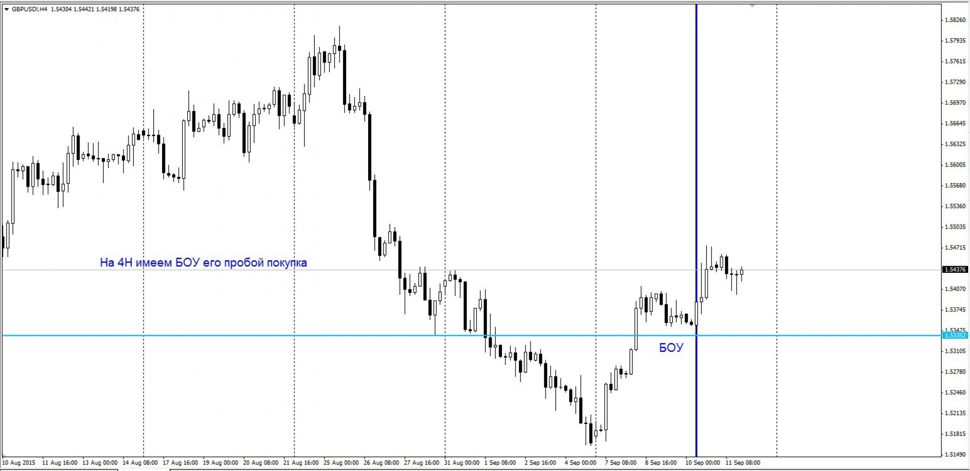 3) На ТФ H4 идет бычьи движение, пробит МОУ сверху вниз, вполне вероятно может произойти ложное медвежье движение, которое должно сформировать БОУ.