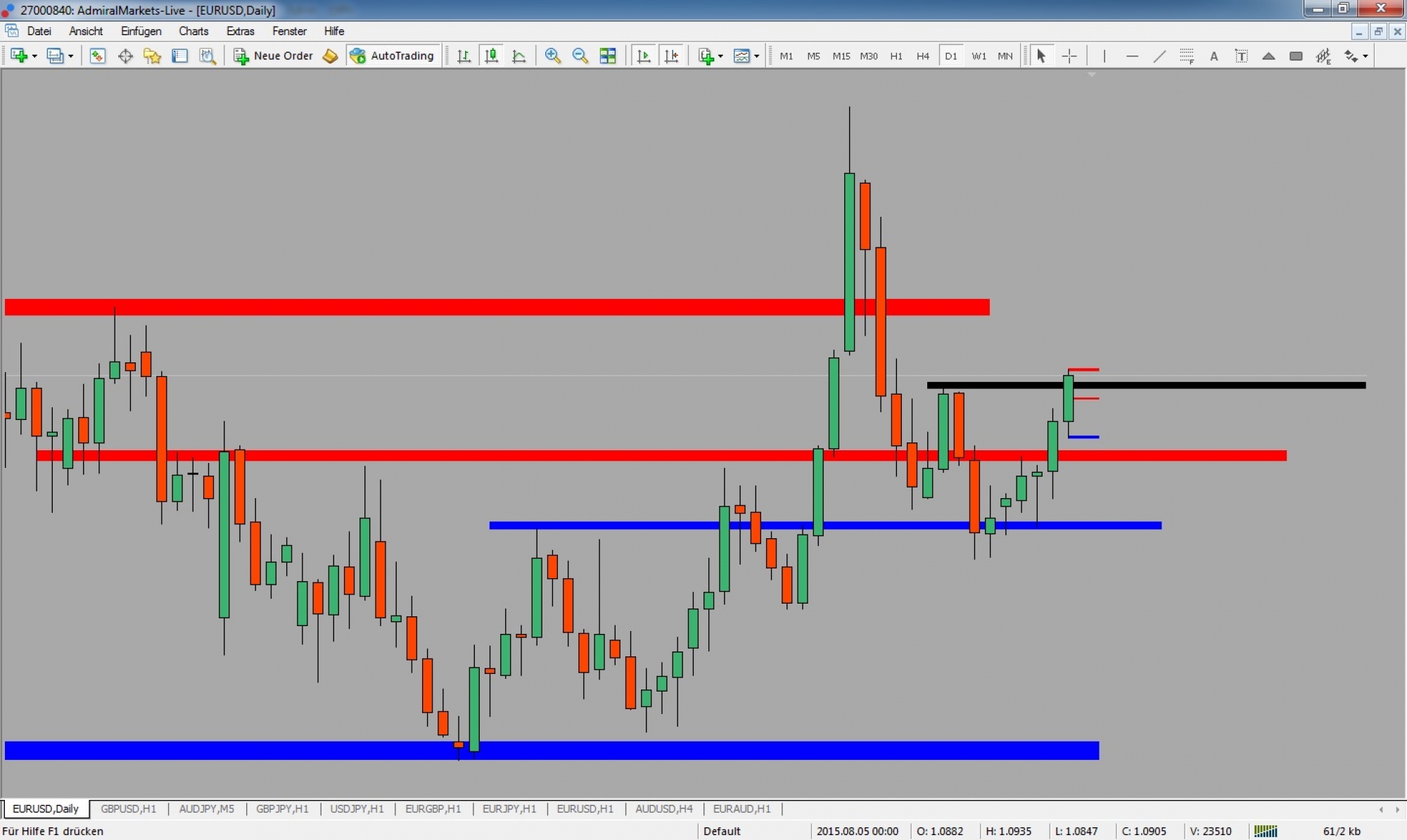 2) На ТФ D1 пара демонстрирует бычью тенденцию — пара закрылась выше МОУ, и вполне возможно она продолжиться, для восхождения к следующему максимуму скорее всего потребуется формирование БОУ.