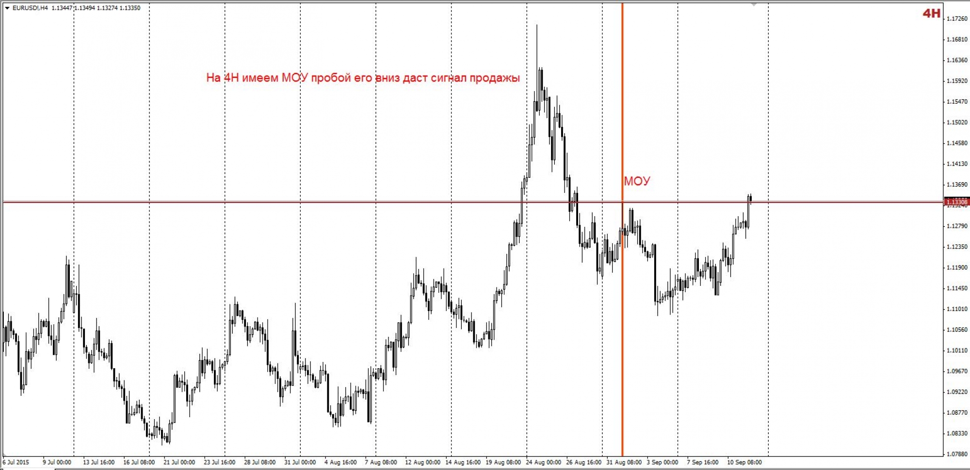3. На ТФ H4 в рамках ретеста пробитого на D1 уровня идет формирование своего МОУ (МОУ на H4)