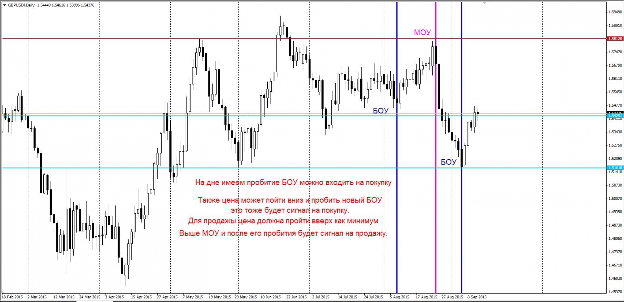 2) На ТФ D1 царствуют быки, подходим к МОУ сверху вниз, при пробитии уровня входим в сел, приоритет за медведями, альтернатива короткий бай, формирование БОУ и его пробитие в бай.