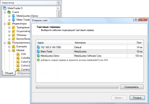 В МТ5 реализован навигатор, который управляет многими операциями в терминале – как открытием нового демонстрационного счета, так и наложением индикаторов, экспертов, скриптов на графики цен. Реализованы такие возможности, как автоматический поиск серверов по названию брокера, самостоятельное редактирование программ, скачивание советников, скриптов, индикаторов из Code Base всего одним кликом, быстрый запуск тестирования стратегий, максимально удобная группировка программ.