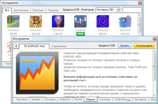 Что касается инструментов, то и тут Форекс терминал предлагает немало нового: теперь трейдер может просматривать суммарную информацию про состояние активов по открытым позициям, рыночные события отображаются на графиках торговых инструментов, есть возможность покупки любого продукта для использования в терминале через Маркет, трейдер имеет доступ к большой базе бесплатных исходных кодов MQL5.