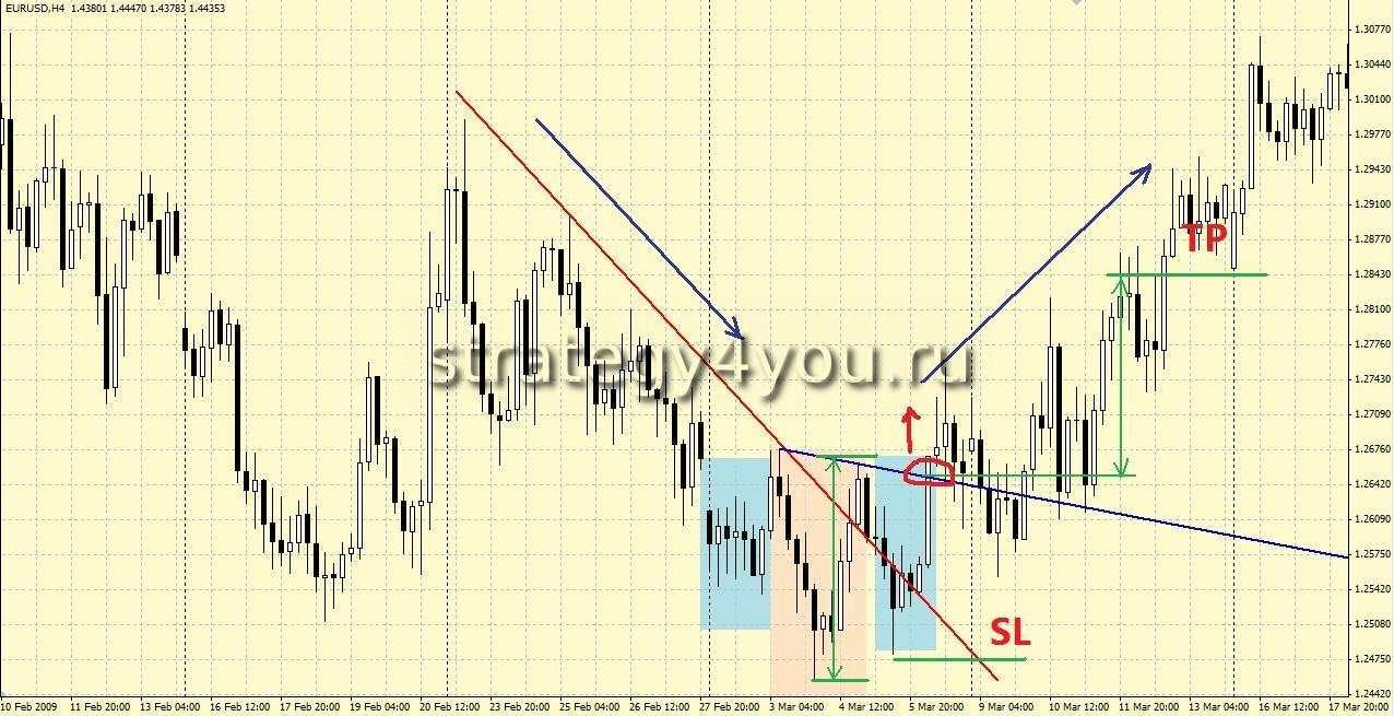 1) За линию тренда, канала (под линию, которую пробила цена вверх при покупках и выше линии, при пробое вниз).