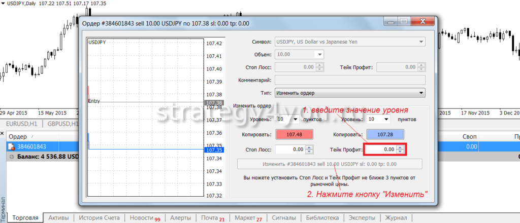 - значения стопа лосса и тейк профита (изменить ценовые позиции);
