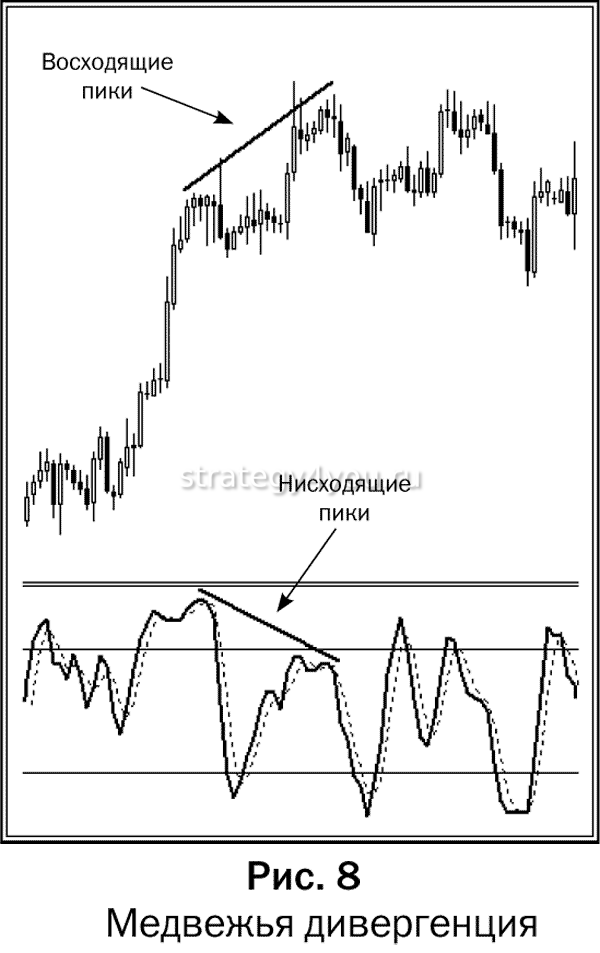 Если на графике вырисовывается медвежья дивергенция, это означает, что цены неуклонно сползают вниз и трейдер должен готовиться к продажам.