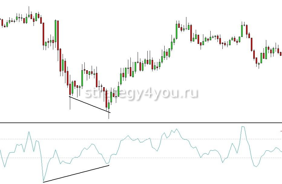 Хотя минимальные цены будут расположены примерно на одной линии, индикатор может показать другую картину, где второй Min будет существенно выше предыдущего. При выполнении этих условий наступает бычья дивергенция, во время которой инвестор должен стоять на старте покупок.