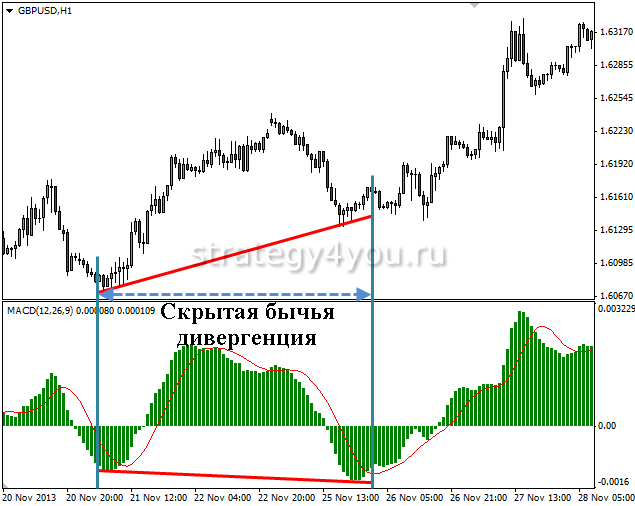 Кроме классического расхождения цен, на Forex может появляться и скрытая дивергенция, сообщающая участникам биржи о продлении существующего тренда. В терминале рассмотреть ее достаточно проблематично. Она дает четкий сигнал инвестору, который должен открывать сделки на покупку активов или их продажу.