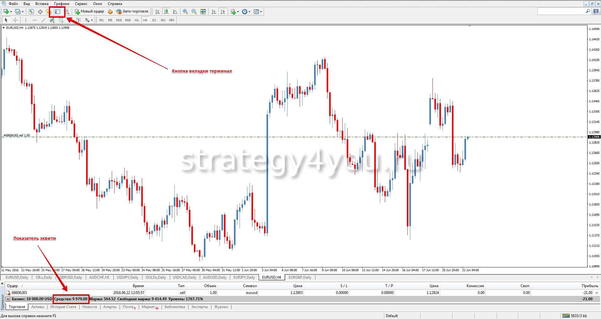 Расчет Э-индикатора используют для анализа выбранной ТС. Используя торговую платформу MetaTrader4 (МТ4) можно увидеть эквити, нажав на вкладку «Активы» и выбрав соответствующий инструмент на приборной панели. Во время торгов для контроля за балансом ССК биржевик использует вкладку «Торговля».
