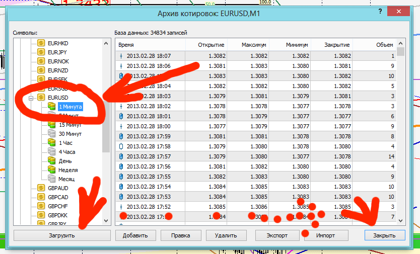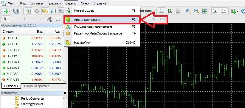 Перезапуск терминала, загрузка котировок из архивов (с выбором нужного актива). Делают это через раздел «Сервис» или нажатием клавиши F2.