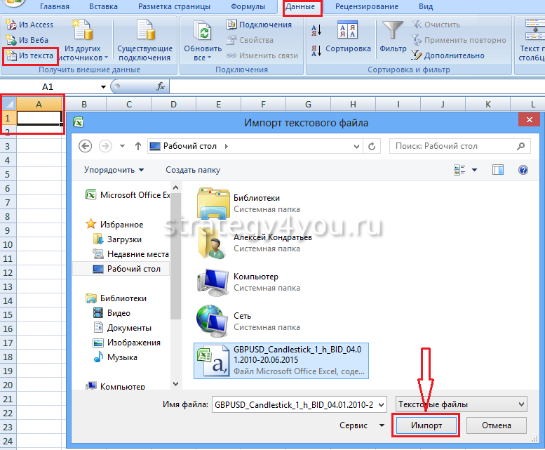 - Импортировать данные в Excel: нажать вкладку «Данные/Из текста». Запустится мастер импорта текстов, нажать на первой вкладке «Далее»,