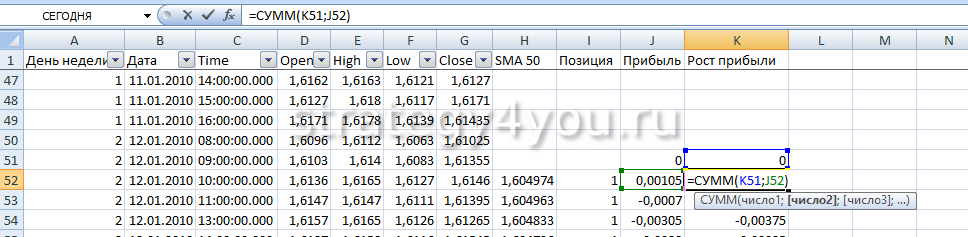 - В следующей колонке рассчитывается доход в соответствии с направлением позиции с функцией ЕСЛИ. Значения в колонке «Прибыль» суммируются функцией СУММ и число получено положительное – значит, система приносит доход.