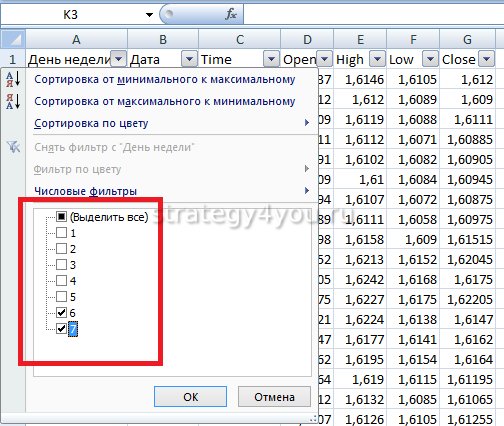 - Далее нужно выделить первую строку таблицы, установить фильтрацию на нее: оставить в таблице лишь 6 и 7 дни (СБ и ВС), выделить их, удалить. Также фильтрацией колонки Time убрать временные периоды, которые не используются: 0-7, 12-13, 17-23.