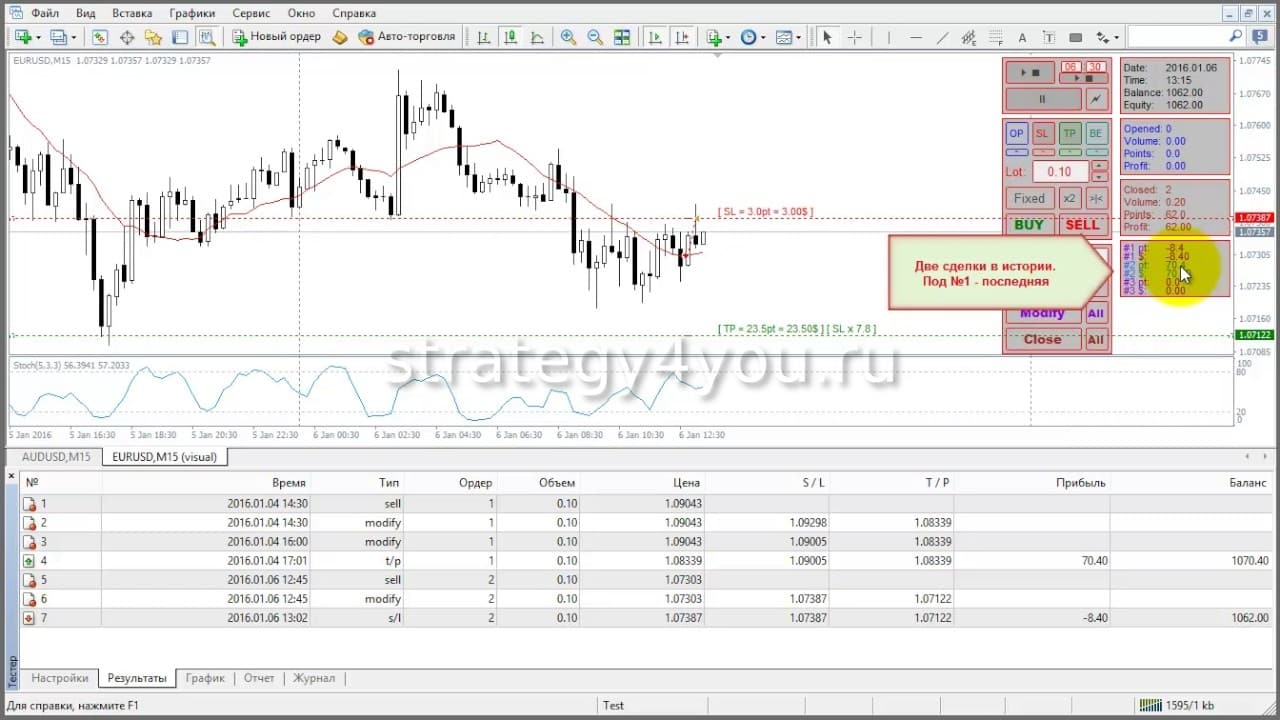 - Отсутствие необходимости учитывать множество данных, что-то записывать и запоминать – по завершении процесса тестирования программа выдаст полный отчет с суммами заработка, процентом убыточных/прибыльных сделок, степенью просадки и т.д.