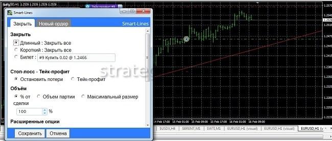 - Возможность открытия/закрытия позиций при пересечении трендовых/горизонтальных линий.
