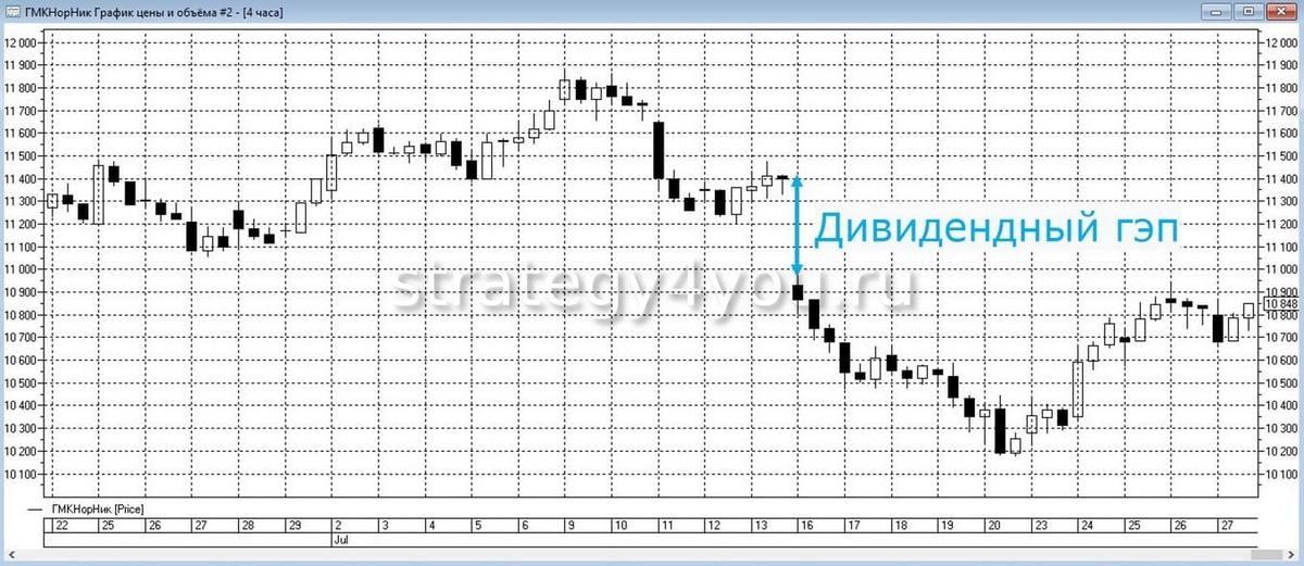 - Дивидендный гэп. Он появляется, когда закрывается реестр акций. Происходит снижение стоимости ценных бумаг на величину дивидендов.