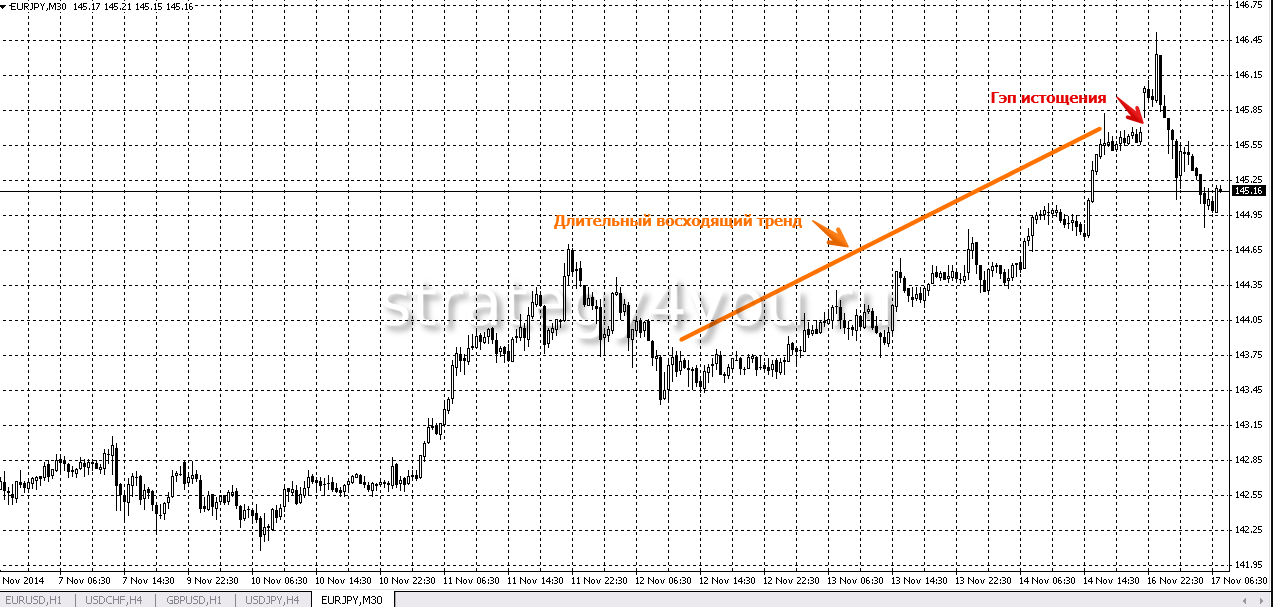 - Истощение. Скачок цен сигнализирует о том, что тренд завершается. Если разрыв появляется после длительного движения цены, торговый объем высокий, это может указывать на разворот тренда.