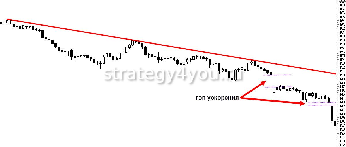 Ускорение. Ситуация аналогична той, которая формируется при гэпе на прорыв, но значимые ценовые уровни цена не преодолевает. Разрывы образуются в середине тренда, торговый объем высокий. Скачок котировок указывает на то, что текущая тенденция сильна и она продолжится.