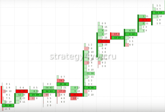 Для того чтобы было видно, в какую сторону направляется цена, специалисты изобрели кластерный график. На каждый его бар наносят объемы.
