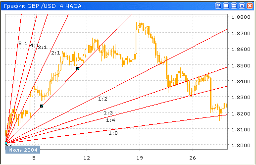 Построить веер Ганна можно с помощью индикатора или инструмента уже встроенного в Мета Трейдер 4.