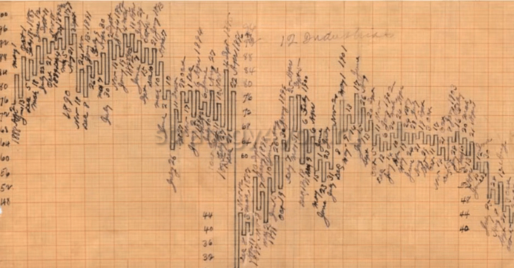 Если перевести с английского, “свинг” означает колебание. Ганн под этим понимал структуру, которая подтверждала сигнал к развороту. Трейдер вручную чертил графики в виде “змейки”, он использовал их вместо баров, вручную подписывал цены. По внешнему виду он определял направление тренда.