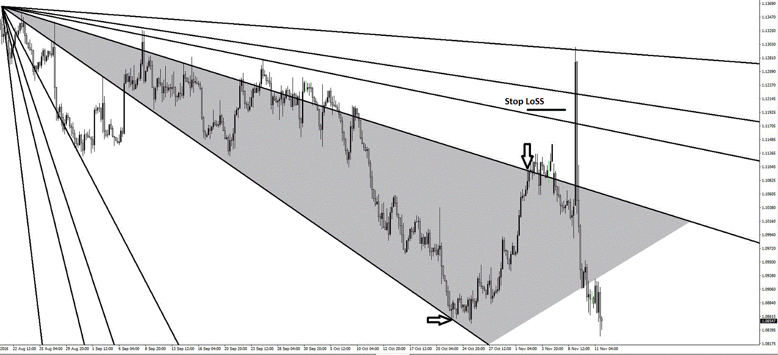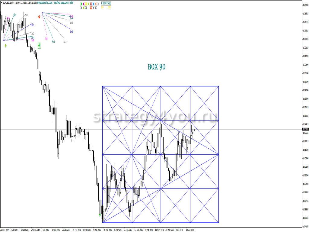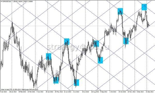 Сетка помогает определить, куда будет двигаться тренд. При ее построении линии проводят под углом 45 градусов. Уильям предполагал, что такие линии представляют собой восходящие и нисходящие линии тренда.
