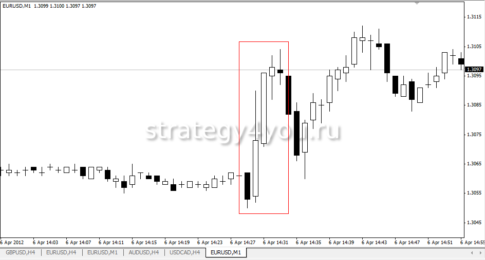 - Поспешность нежелательна, однако начинать торговлю допустимо уже через 5 минут после выхода новостей. За это время успеет сформироваться первая свеча. Заключать сделки рекомендуется в пятиминутном таймфрейме. Свеча должна быть длинной и бычьей, с маленьким фитилем.