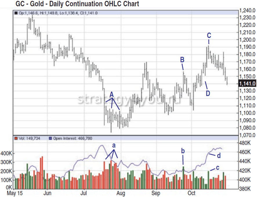 Ту же закономерность можно выявить и для обратного, нисходящего движения тренда. Ценовая тенденция будет продолжаться с большой вероятностью, если сопровождается повышением открытого интереса среди покупателей и продавцов.