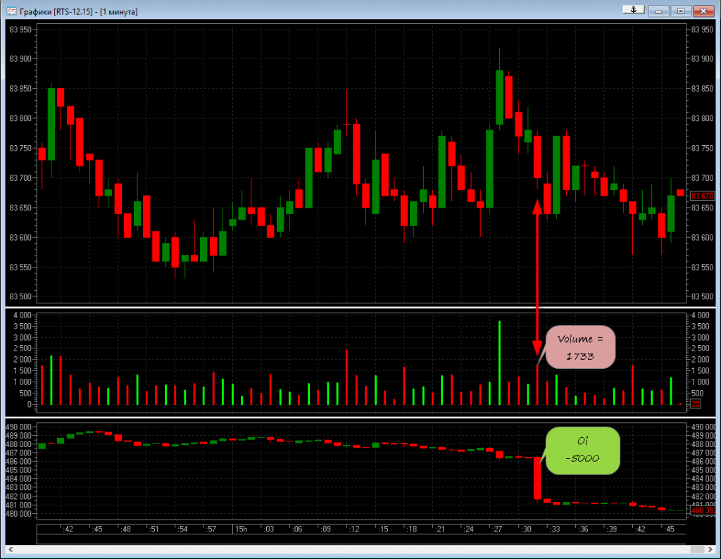 Таким образом, ОИ изменяется в прямой пропорции только к числу предлагаемых контрактов, а объем — в зависимости от суммарного количества сделок. По факту совершения сделок значение индикатора объема всегда возрастает, а показатель ОИ при тех же условиях способен сохранять позиции или убывать.