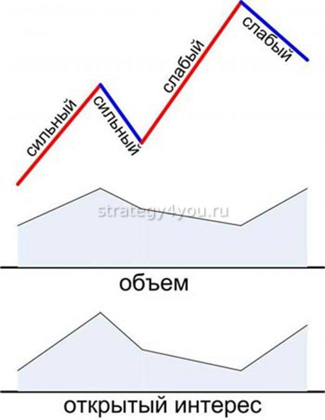 Рост цены на сильном рынке повышает вероятность пробоя трендовых линий (соответсвенно и смены направления тренда) и ценовых уровней, тогда как ее падение делает возможным отскок в дальнейшем. Таким образом, сопоставительный анализ индикаторов ОИ и объема демонстрирует «упругость» рынка.