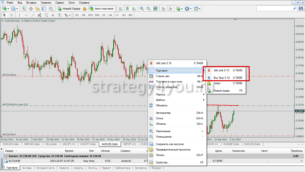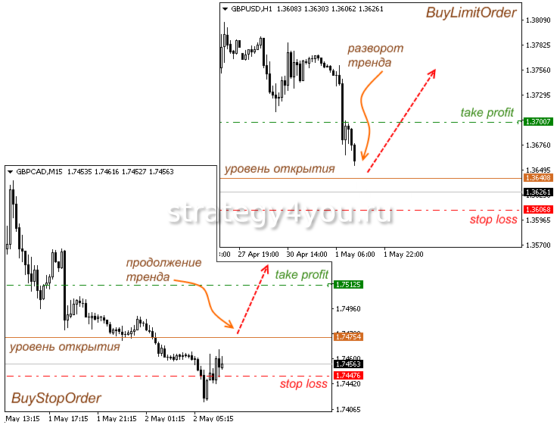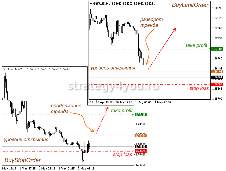 Использование приказов позволяет открыть позицию в направлении тренда. Разворотные инструменты Buy и Sell limit открываются на противоположно к трендовому движению, что позволяет увеличить прибыль на откате.