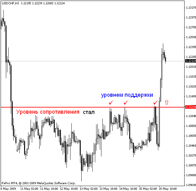 Как только цена актива начинает приближаться к уровню сопротивления, открывается большое количество сделок на продажу. Такие действия оказывают влияние на цену актива — направление движения изменяется.