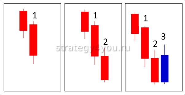 Сделку открывают только после того, как свеча номер 3 пройдет рубеж максимального или минимального показателя второй.
