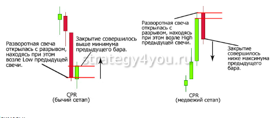 Такую аббревиатуру можно расшифровать как Closing Price Reversal — это разворот на закрытии цены. Такой паттерн Прайс Экшен состоит из двух баров противоположной направленности, и отыскать его на графике несложно. Эту комбинацию часто называют обманной.