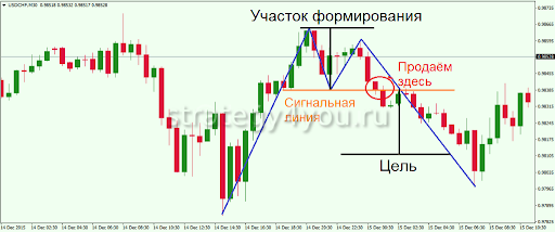Чтобы открыть ордер на продажу, нужно прочертить линию от края нижней тени свечи, расположенной посередине. Как только эту линию пересечет телом другая свеча, сделку можно открыть.