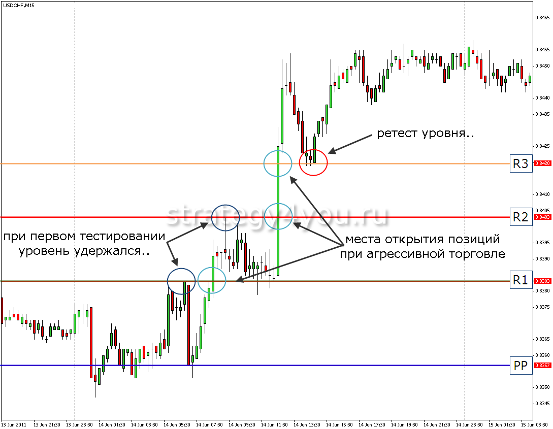 С точками работают аналогично торговле с уровнями поддержки/сопротивления. Как только цена доходит до R отметки, нужно следить за формированием моделей разворота или появлением сигналов по индикаторам. Когда они есть, можно открывать сделки на продажу. Если цена доходит до отметки S, ищут паттерны разворота, а когда находят – открывают сделки на покупку.