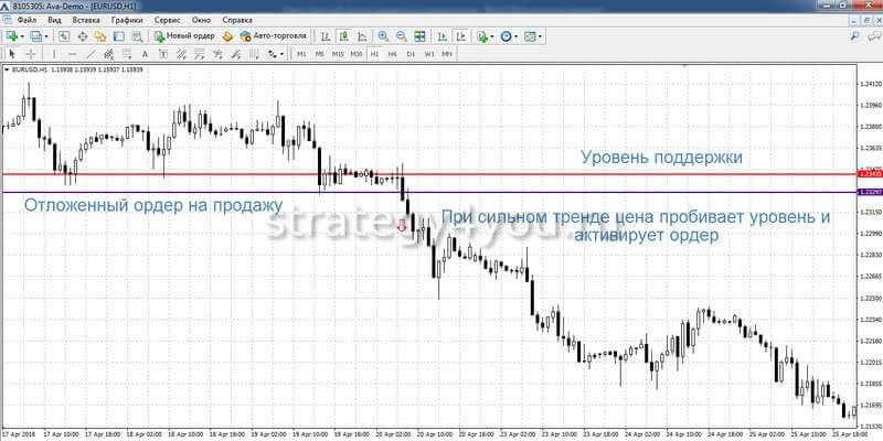 Торговля на пробой ведется также с отложенными ордерами. После нахождения уровня на определенном расстоянии устанавливается отложенный ордер «stop»: в случае торговли от поддержки ордер ставят на пару пунктов ниже, от сопротивления – выше.
