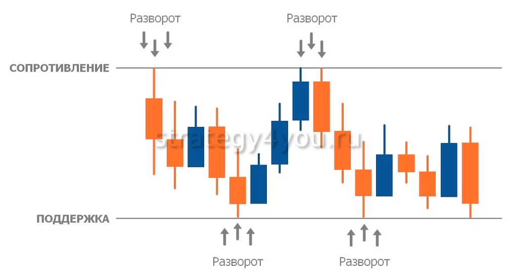 - Закрытие свечи за границами диапазона – выше сопротивления или ниже поддержки.