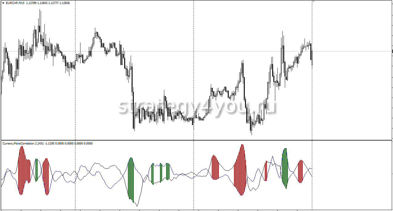 На графиках тренды валютных активов с прямой корреляцией отображаются похоже – когда падает/растет стоимость одного, так же ведет себя цена второго. Если корреляция обратная, то цены могут двигаться в практически зеркальном отображении. Но самостоятельно визуально все это распознать и проанализировать бывает трудно.