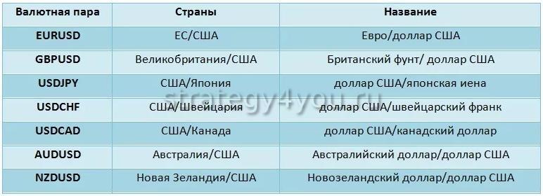 Основные валютные пары на Форекс – это те, в состав которых входит доллар США. Как правило, это валюты самых значимых в плане экономики стран – США, Европейский Союз (не страна, но у объединения есть своя валюта), Великобритания, Австралия, Новая Зеландия, Япония, Швейцария, Канада и т.д.